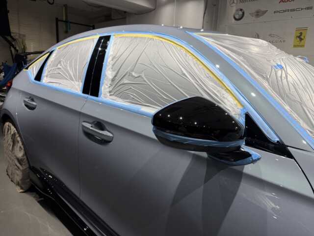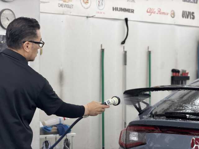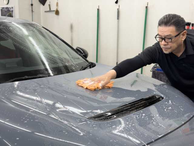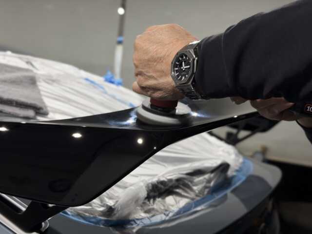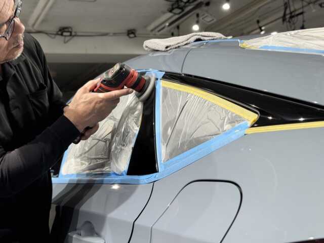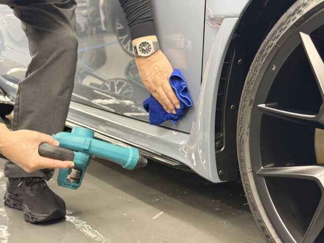 しっかりリンスをしたら、大判タオルで拭きあげ、ブロワーで細部をしっかりと乾燥させていきます。乾燥後マスキングにて車全体を養生したらいざ研磨〜