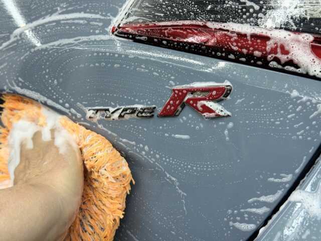 新車のはずのシビックタイプR。けれど入庫したボディには、意外にも汚れの固着や雨ジミ、細かな洗車キズが点在していました。高性能な塗装ほど状態の差が仕上がりに直結します。今回は下地をリセットし、Type Rらしい深い艶と輪郭を引き出すコーティング施工を行いました。
