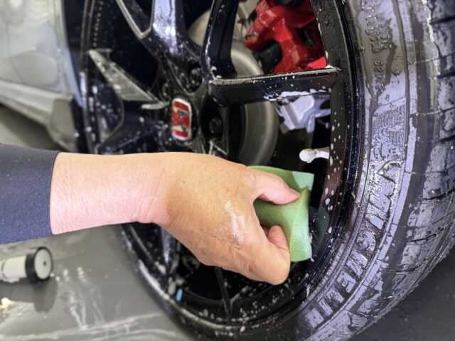 さあ入魂開始!まずはマット素材のホイールから。タイプRの場合、このマットホイールをさらっと洗ってしまうと後で後悔します。しっかりと洗浄し、よく確認しておかないと二度手間になってしまうので要注意。