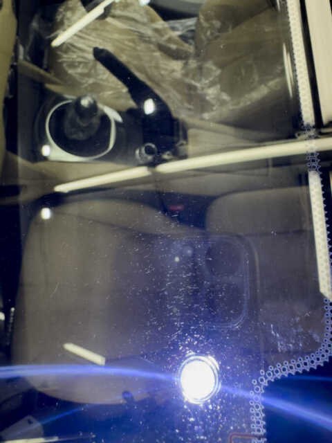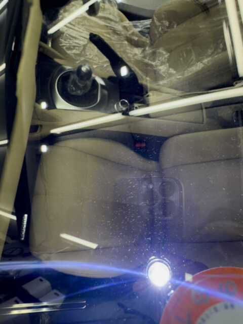これはフロントウインドウの内側についているマイクロファイバーのリント(糸くずのようなもので細かい繊維がこびりついたものです)ディーラーで使っているものが安物で毛が抜けるマイクロファイバーで内窓を拭いたのでしょうかね〜 結構これを取り去るのがとても大変なので、粗悪なマイクロファイバータオルには注意しましょう。