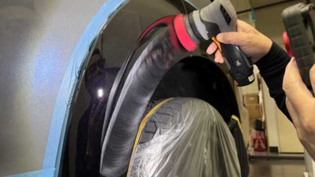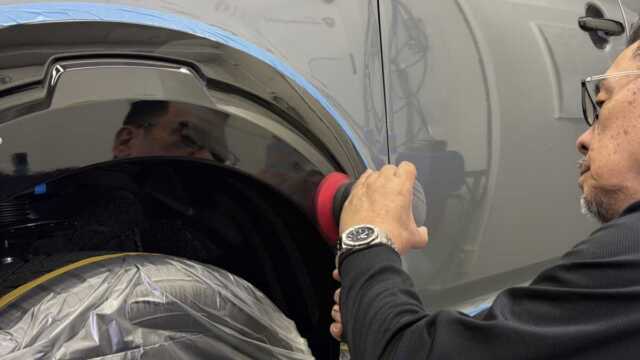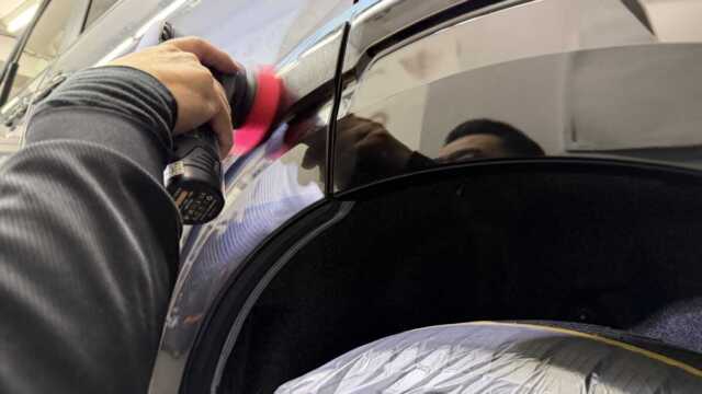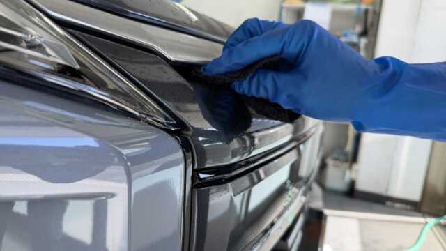 研磨が終わったらボディコーティングを1パネル1パネル時間をかけて行い、その後ホイールや未塗装樹脂のパーツも専用コーティングで仕上げていきます。