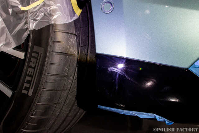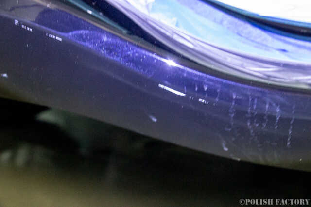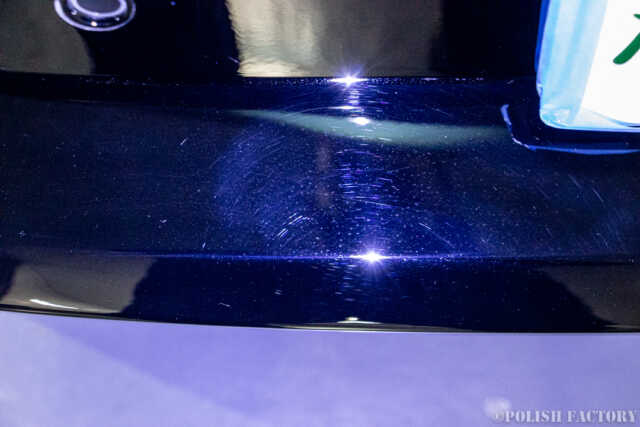 新車ではありますが、輸送時や展示中についた微細な傷や汚れが見られました。また、新車時に磨かれた機械磨き修復の跡も多数確認されました。ガイシャアルアルです。