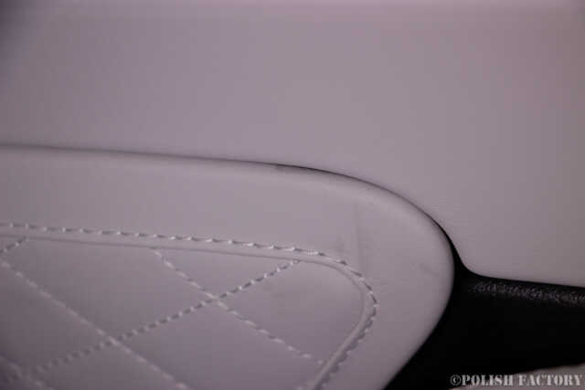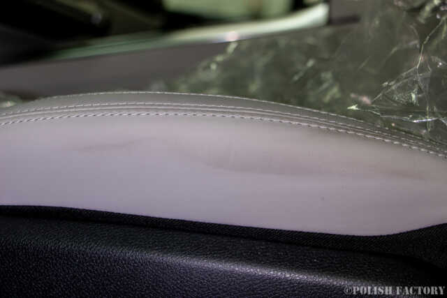 革シートの座面横も既に汚れの線が出来ておりました〜 サイド面の上下の中間部くらいに横一直線に汚れが見えます。
