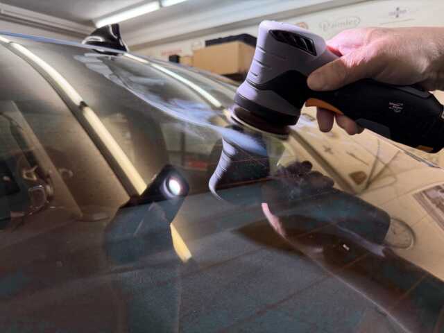 シミの具合に応じてポリッシャー等も変えつつひたすらウインドウガラスと向き合います。