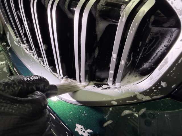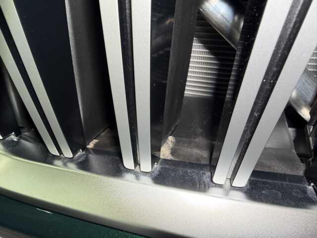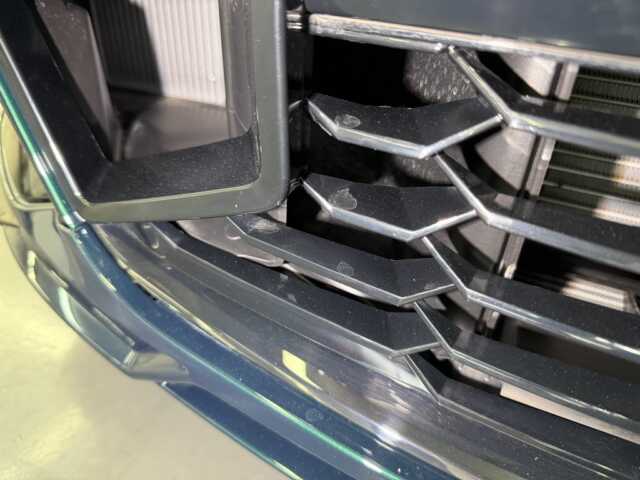 Fグリルの付け根にはたっぷりの砂塵が!新車でも輸入車の場合、軽く擦っただけでは除去できない強烈な汚れがついてることがありますー