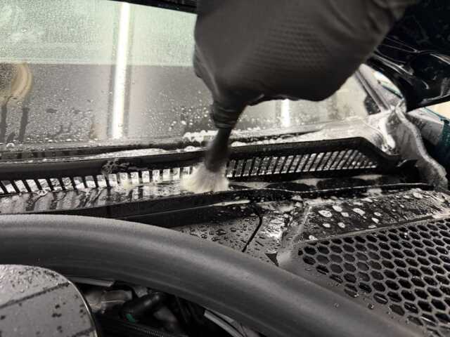 カウルトップはきっちり洗浄後樹脂部分のシミなどを丁寧に除去します。新車でも洗車後にボンネットを開けてきっちり水分を拭いておかないと瞬く間に水シミが発生です泣