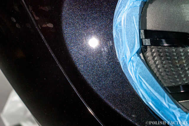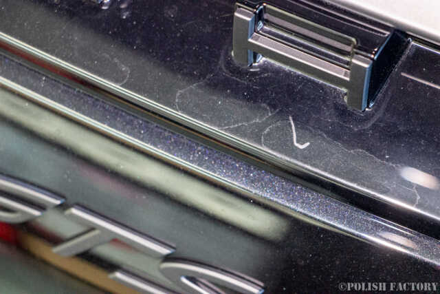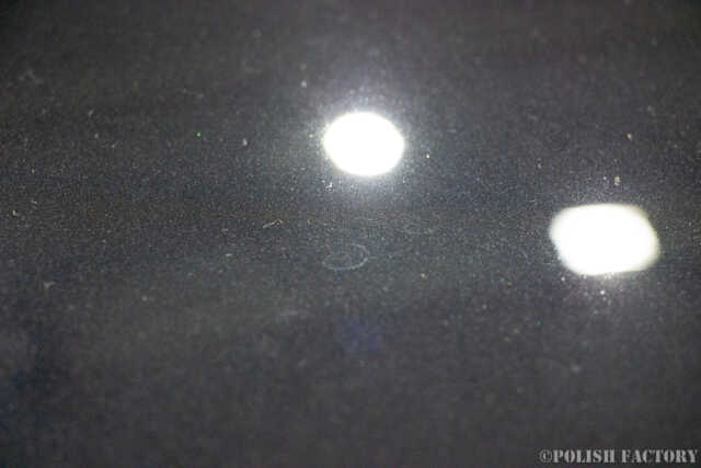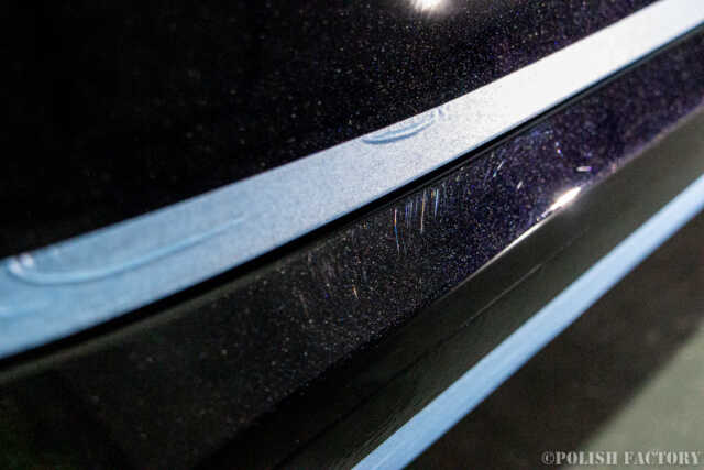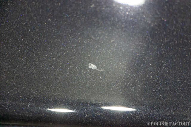 新車ではありますが、輸送時や展示中についた微細な傷や汚れが見られました。また、新車時に磨かれた機械磨き修復の跡も確認されました。