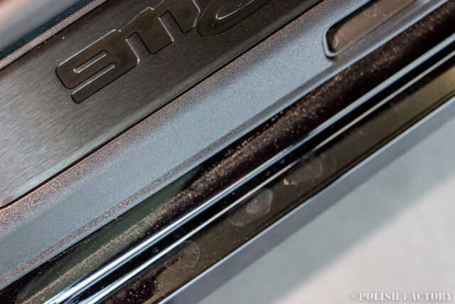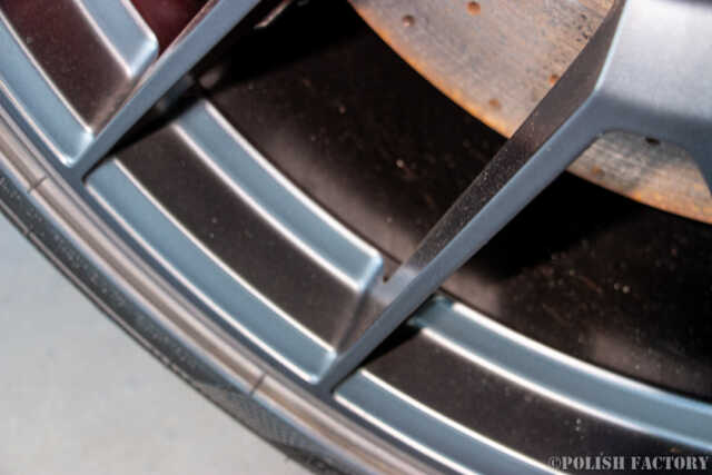 スポイラー下の未塗装樹脂に固着している砂塵汚れ。砂塵はバカに出来ない汚れです。