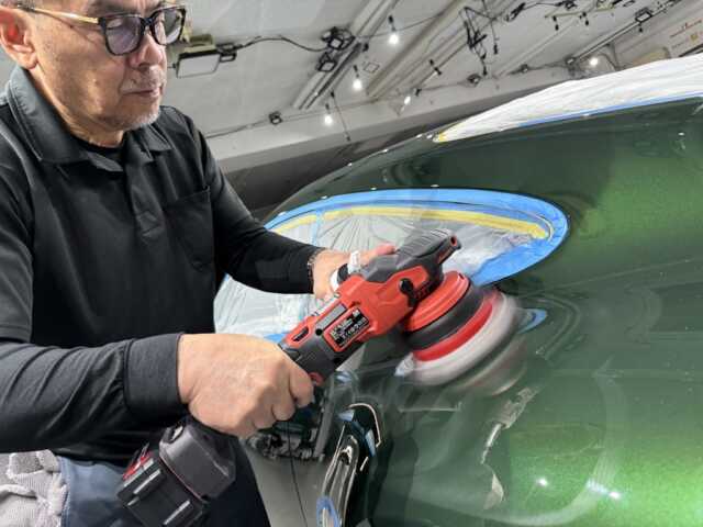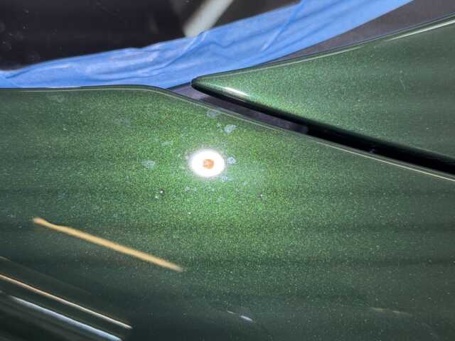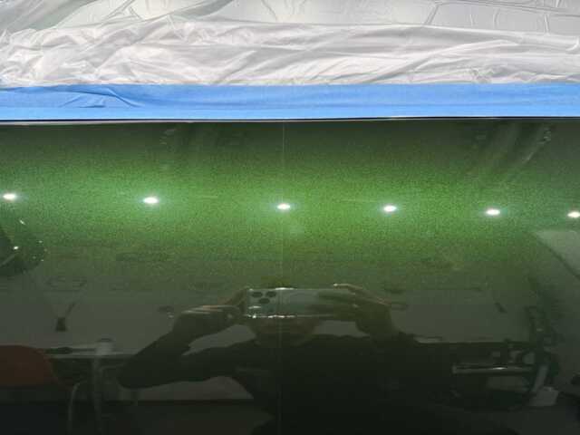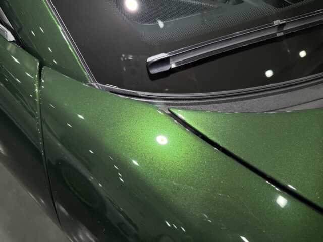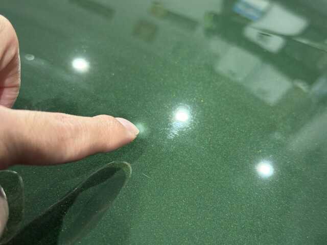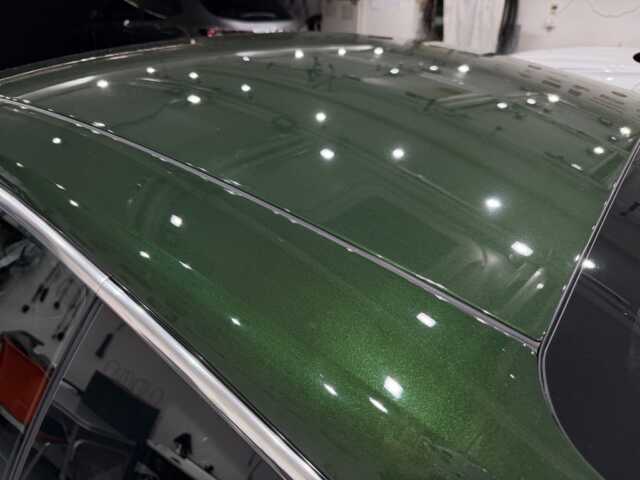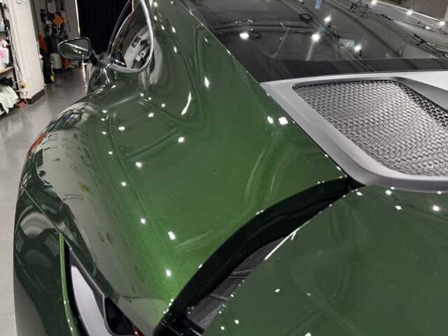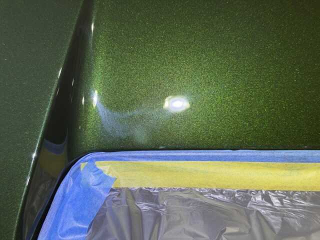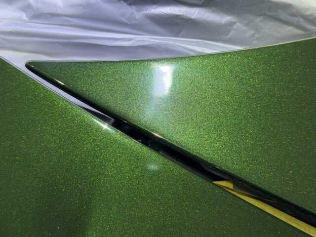 右側が研磨後、左側が研磨前(=新車納車直後)です。右側が濃い緑なのが分かりますか?これが丁寧な研磨の効果です。コーティングする前の写真ですので磨きでここまで変わります(実物はもっと分かりやすい)