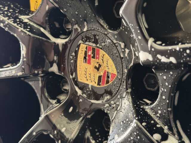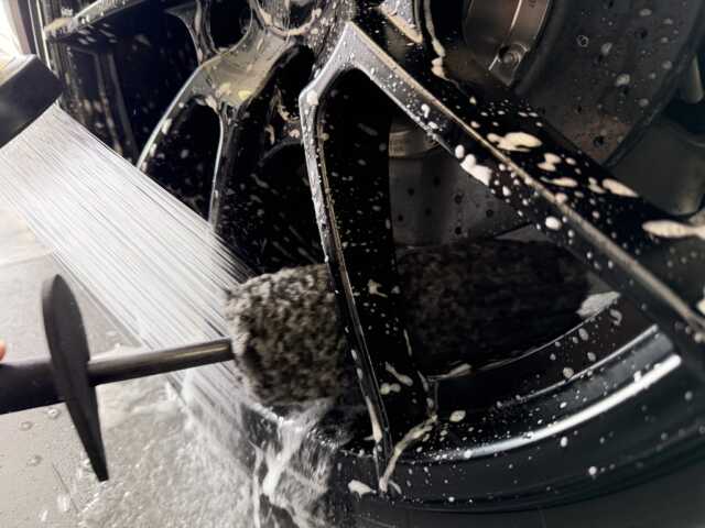 黒いマット系のブラックホイールは弊社での洗車時に傷がつかないよう柔らかいマイクロファイバー系のブラシで洗浄いたします。何気なくこういうところへの配慮があるかどうかを施工記事や動画でみると良いお店選びにつながるかも?しれません。