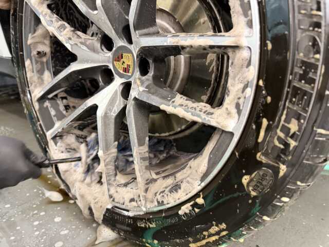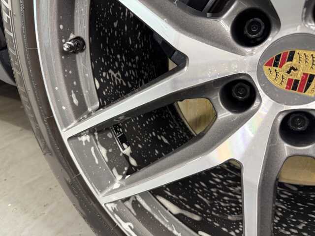 もちろん軽くシャンプーで洗っただけでは汚れは落ちません。ケミカルを駆使してリスクは最小限に頑固な鉄粉やウォータースポットを除去していきます。たまにyoutuberでホイールのシミとりには「これ!」と紹介している方もいますが、危険です。特に経年車はそれまでの環境やその車種の特性、ホイールの状態によってそのケミカルを使ったら「一発アウト」な場合もございます。