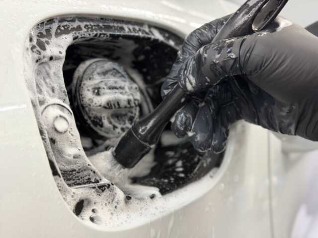 給油口も丁寧に洗浄した後、ブロワーで乾かし状態を確認しつつ頑固な汚れを除去していきます。