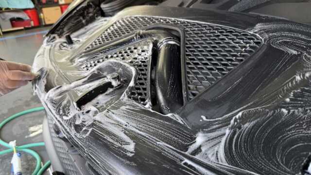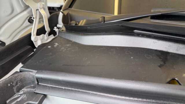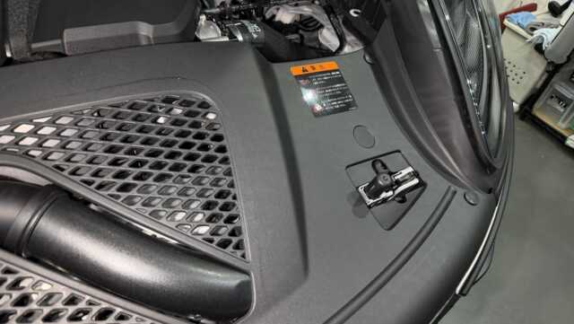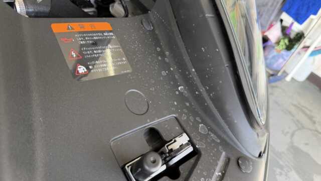 ボンネットを開けると未塗装樹脂部に無数の輪ジミが・・