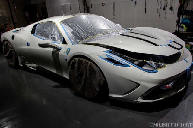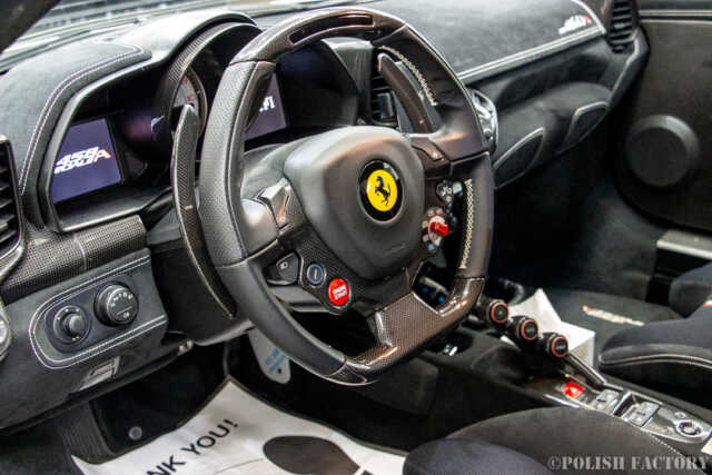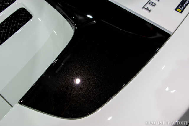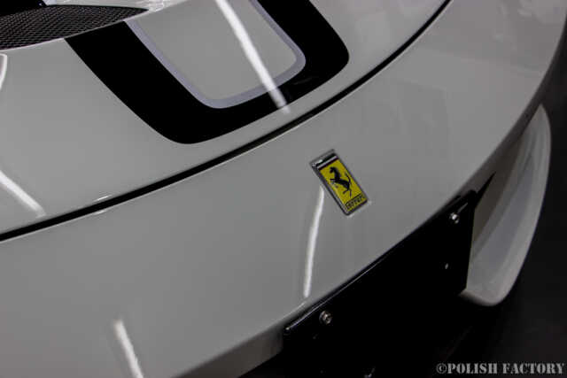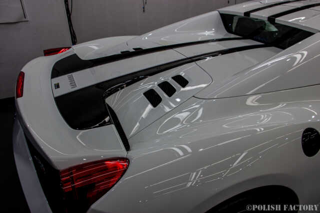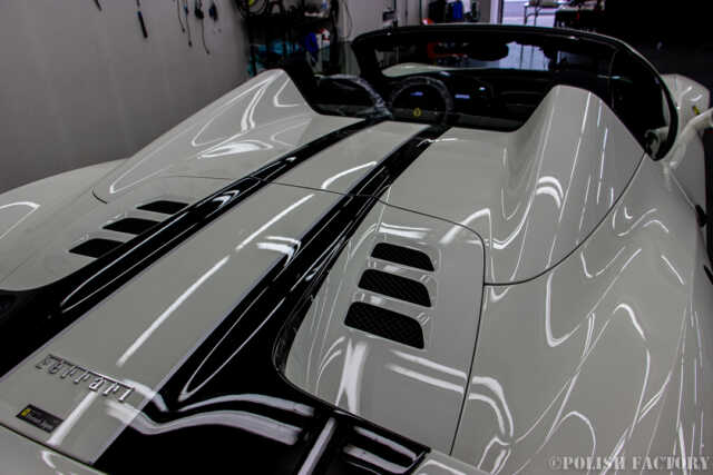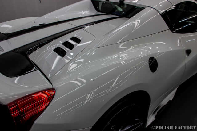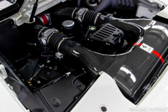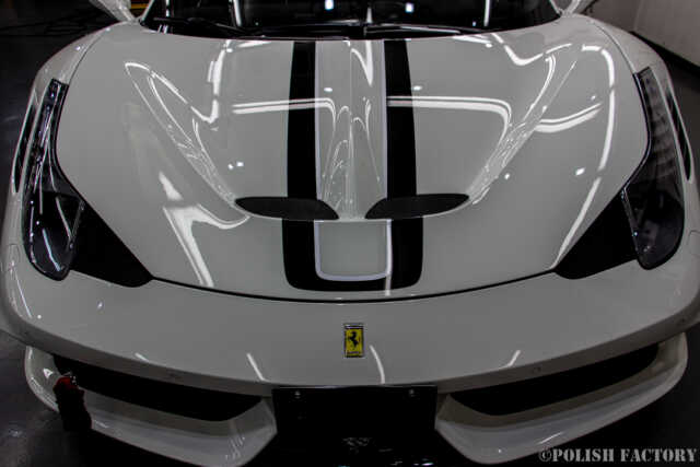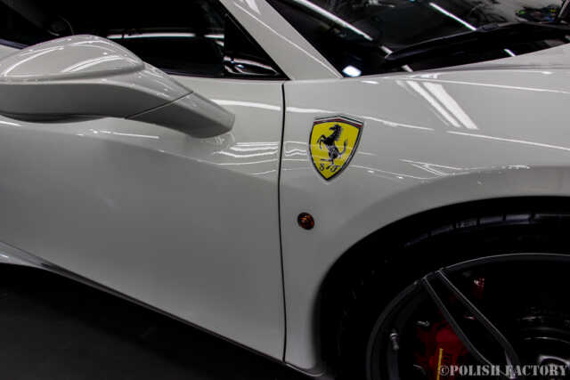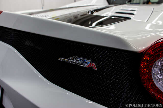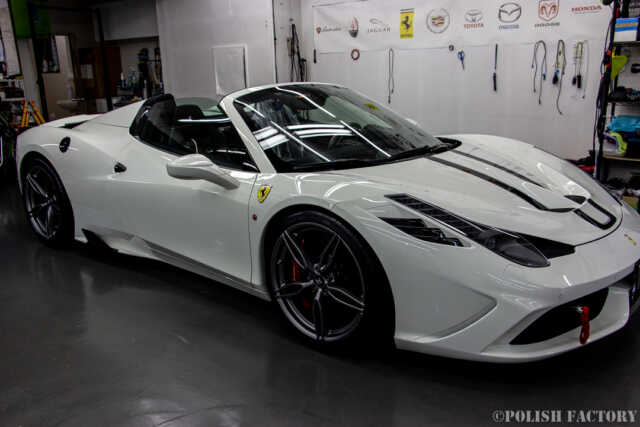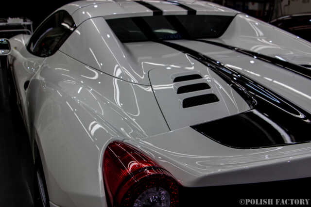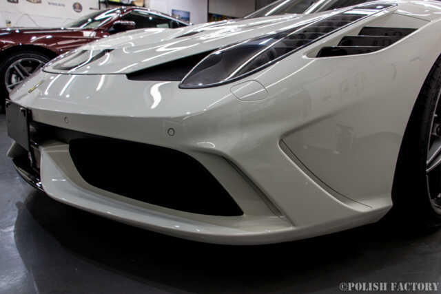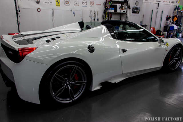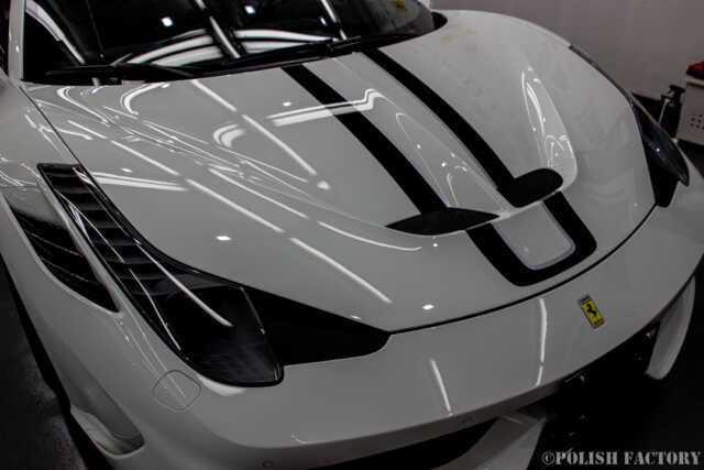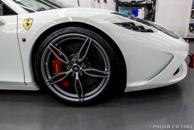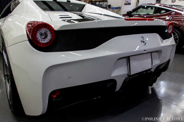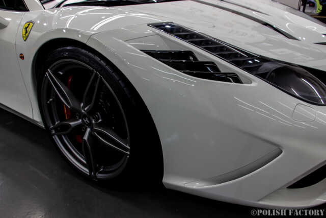 Ferrari 458speciale apertaという素晴らしい車両に施工できたことを光栄に思います。特に白色の車体は水垢や汚れが目立ちやすいため、下地処理に時間をかけ、完璧な状態でコーティングを行いました。Y様に喜んでいただけて嬉しく思います。