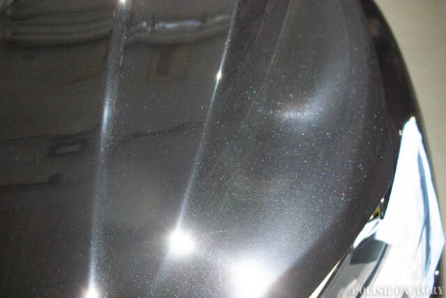 白ぼけしたボンネット。これは完全に下地磨きでついた「磨き傷」それと相まってコーティングの白ぼけです。